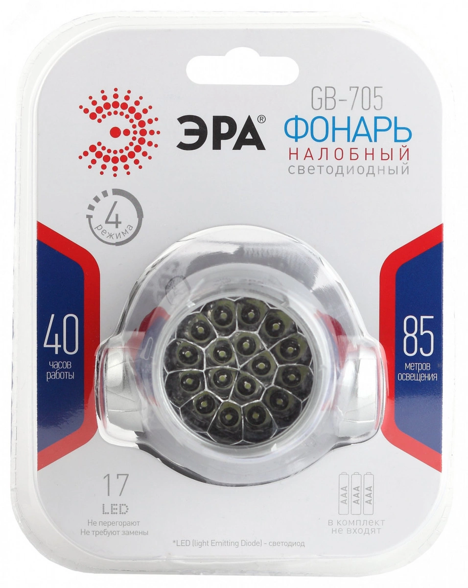ЭРА GB-705 компактный налобный фонарь с 17 яркими светодиодами, которые не перегорают и не требуют замены. Работает от трех мизинчиковых батареек. Одного комплекта элементов питания хватает на 42 часа непрерывной работы. Стильный черно-серебристый дизайн. Корпус изготовлен из ударопрочного пластика. Современная светодиодная технология создает свет высокой дальности до 85 метров. Доступны 4 режима работы: освещение высокой яркости, оптимальной (средней) яркости, экономичный режим с минимальным свечением и режим SOS в формате мигания. Мягкий ремешок с регулировкой размера в комплекте. Тип лампы Сверхъяркий, суперэкономичный светодиод. Не требует обслуживания и замены на протяжении всего срока службы фонаря. Тип упаковки и комплектация Блистер. Батарейки в комплект не входят.