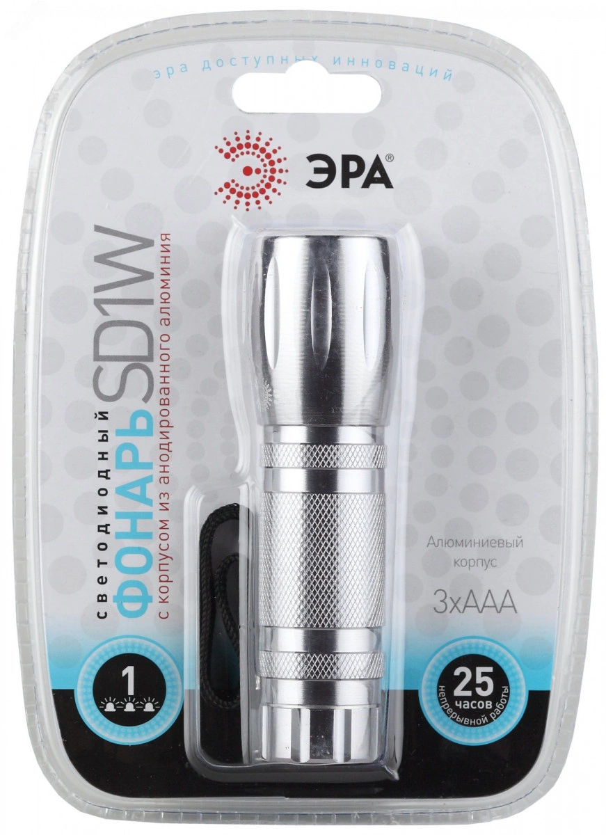 Универсальный светодиодный фонарь. Корпус выполнен из анодированного алюминия. Ручка фонаря очень удобно лежит в руке, фонарь легкий, но не проскальзывает, так как на корпусе предусмотрены специальные насечки. Фонарь работает от трех батареек AAA, а значит, не зависит от наличия розетки. Луч дальностью 125 метров, светит ярко, белым светом. Универсальный фонарь SD1W прежде всего практичный инструмент. Он создан для простых повседневных задач, поэтому он прочный и надежный. В фонаре использован один очень яркий и качественный светодиод мощностью 1 Вт. Портативный размер фонаря также отвечает его практичным задачам. Ведь такой фонарь постоянно нужно брать собой, а поэтому его компактность и вес должны быть минимальны для комфортного использования.