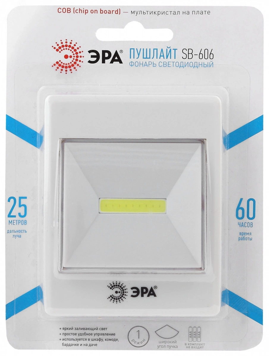 ЭРА SB-606 - компактный светодиодный фонарь-пушлайт для освещения помещений без стационарного света и для дополнительной подсветки затемненных мест. Сверхъяркий и суперэкономичный свет chip on board - мультикристалл на плате. Быстрое закрепление на любой гладкой поверхности. Самоклеящаяся основа и само устройство соединяются друг с другом при помощи прочной липучки. Имеется и дополнительный вариант крепления - углубление для подвешивания на шуруп или гвоздь. В самом центре выключателя расположена LED-плата с целым рядом мелких и очень ярких светодиодов. это промышленная технология, адаптированная для универсальных целей. LED-мультикристаллы не тускнеют со временем и не нуждаются в замене. Они обеспечивают максимально широкий угол освещения с дальностью 25 метров. Устройство экономично - от одного комплекта батареек (3хААА) работает свыше 60 активных часов.