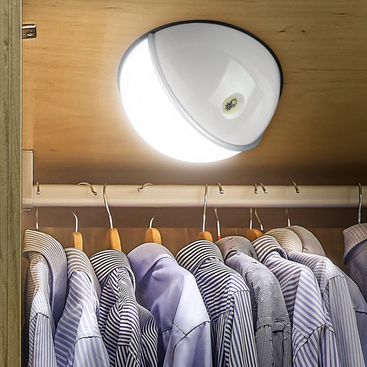 Светодиодный фонарь-пушлайт, компактный, яркий и практичный. Фонарь клеится на любую поверхность, может использоваться, как для аварийного освещения , так и в качестве декоративной подсветки. Пушлайт - это слово образовано от двух английских ''push'' - ''нажимать'' и ''light'' - ''свет''. Для этого фонаря была разработана специальная конструкция, корпус разделен на две части, что позволяет осветить только нужную часть пространства. Фонарь питается от трех батареек ААА и может работать 75 часов без перерыва. Дальность луча составляет 5 метров. Сенсор легко найти, светонакопительный стикер мягко светится в темноте.