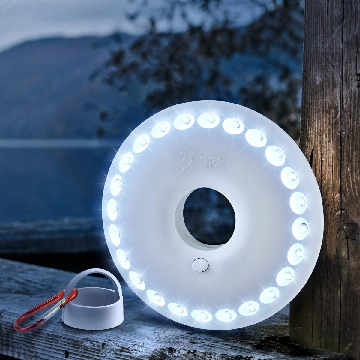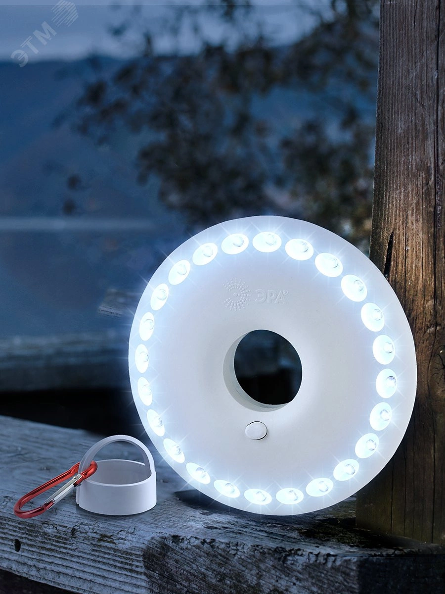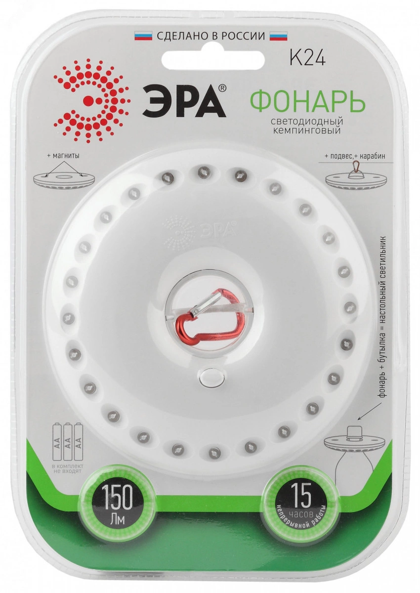 Фонарь собственного дизайна ЭРА, ставший одной из самых популярных туристических моделей. Получил народные названия 'НЛО' или 'Летающая тарелка' за круглую форму корпуса и футуристический внешний вид. Фонари ЭРА К24 и их блистерная упаковка производятся в России. 24 светодиода эргономично расположены на корпусе в круговом формате. Не перегорают, не требуют замены, разумно расходуют заряд и дают яркое освещение. Особое преимущество и настоящая 'фишка' ЭРА К24 - в секретах эксплуатации. Фонарь закрепляется при помощи специального кронштейна (подвес + карабин), превращаясь в яркую походную 'люстру'. Для металлических поверхностей в тыльную сторону корпуса вмонтированы магниты.
