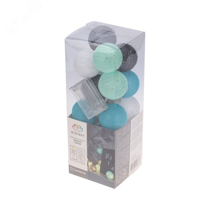 Тайские фонарики ''Северное сияние'' — светодиодная интерьерная гирлянда длиной 3,5 метра, которая имеет необычное, оригинальное оформление. 20 волшебных фонариков, выполненных из хлопковых нитей, располагаются на серебристом кабеле в прозрачной ПВХ-изоляции. Текстильные декоративные элементы, мягко подсвечиваемые изнутри белыми диодами, станут стильным украшением любой обстановки. Гирлянда получает питание от двух батареек АА, которые размещаются в специальном блоке на конце кабеля. Изделия с батарейками можно размещать даже в детских комнатах благодаря повышенной безопасности.