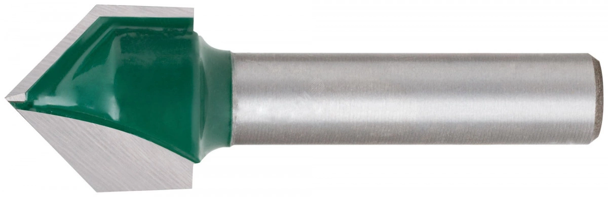 Используется для работ по дереву. Для фрезерования пазов. Угол при вершине 90 градусов. Цилиндрический хвостовик. Материал - инструментальная сталь, с твердосплавными режущими вставками. Упаковка - пластиковая коробка.
