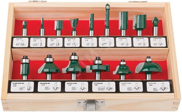 Фрезы по дереву кромочные, набор 15 шт, деревянный бокс, хвостовик 8 мм