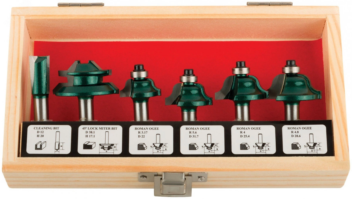 Фрезы по дереву кромочные, набор 6 шт, деревянный бокс, хвостовик 8 мм