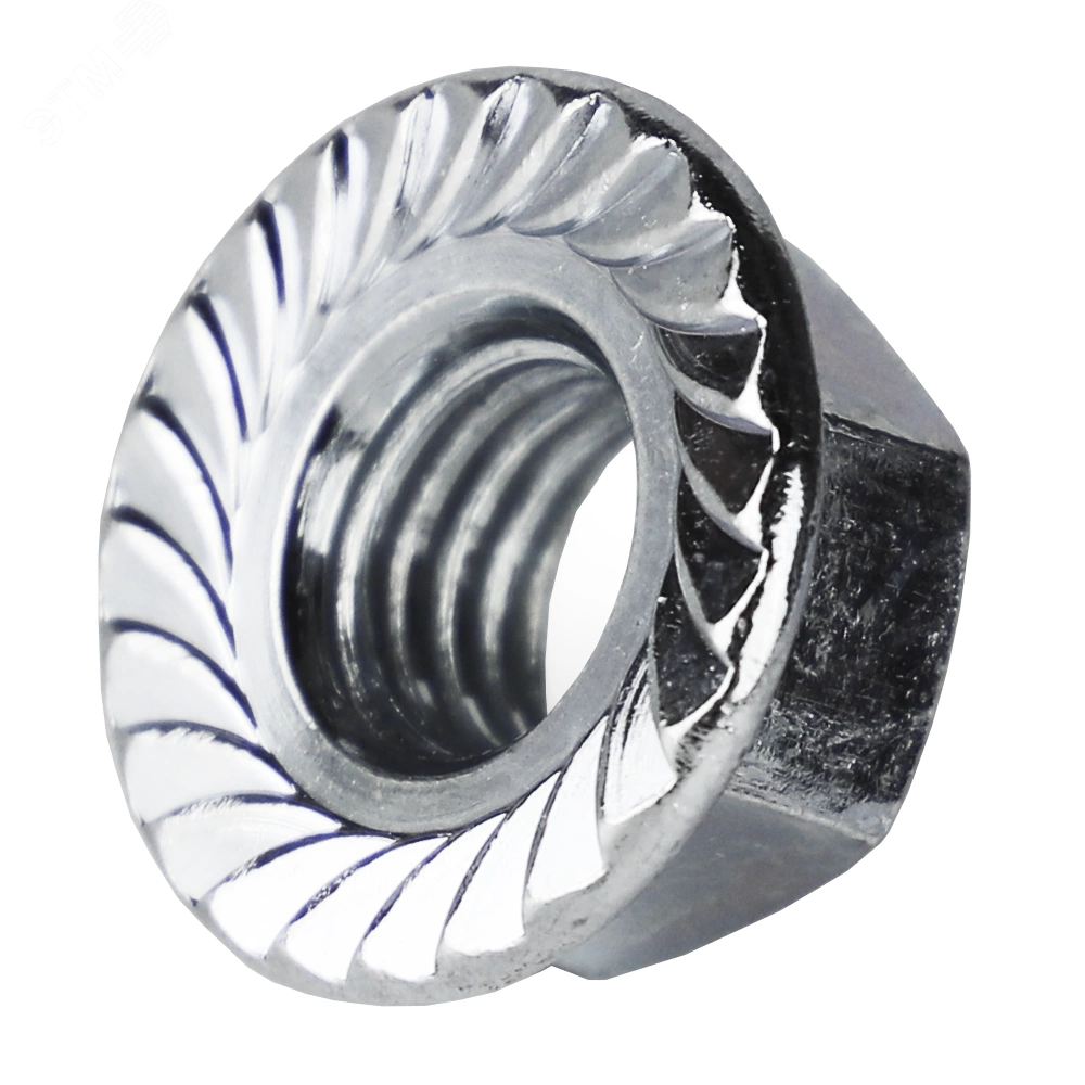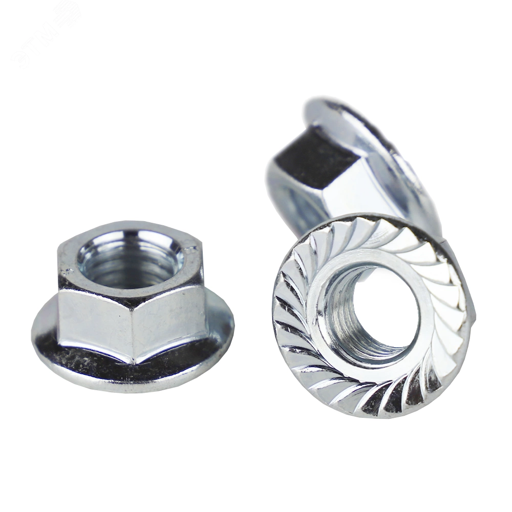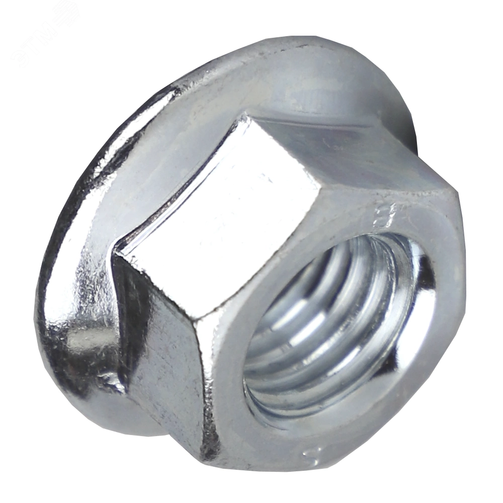 Гайка шестигранная с фланцем. Наличие фланца играет роль шайбы и увеличивает опорную поверхность соединения, поэтому при установке гайки дополнительные шайбы могут не применяться. Используется для монтажа, соединения, крепления элементов конструкций и оборудования совместно с болтами, шпильками с соответствующим размером метрической резьбы. .