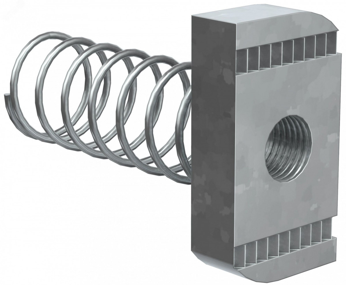 Гайка канальная с удлиненной пружиной предназначена для крепления элементов STRUT-системы между собой, а также кабельных лотков к STRUT-консолям.Используется с профилем сечения 41х41.