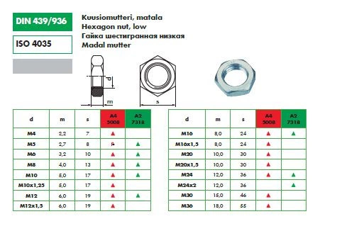 Применяется для создания коррозионно-стойких соединений при сборке и монтаже конструкций, оборудования, приборов. Уменьшенная высота позволяет устанавливать ее в местах с малым зазором. Еще ее называют контргайкой, используют парами или в сочетании с шестигранной полноразмерной гайкой для стопорения резьбовых соединений. Тонкая гайка из нержавейки не ржавеет на открытом воздухе и в агрессивных средах.