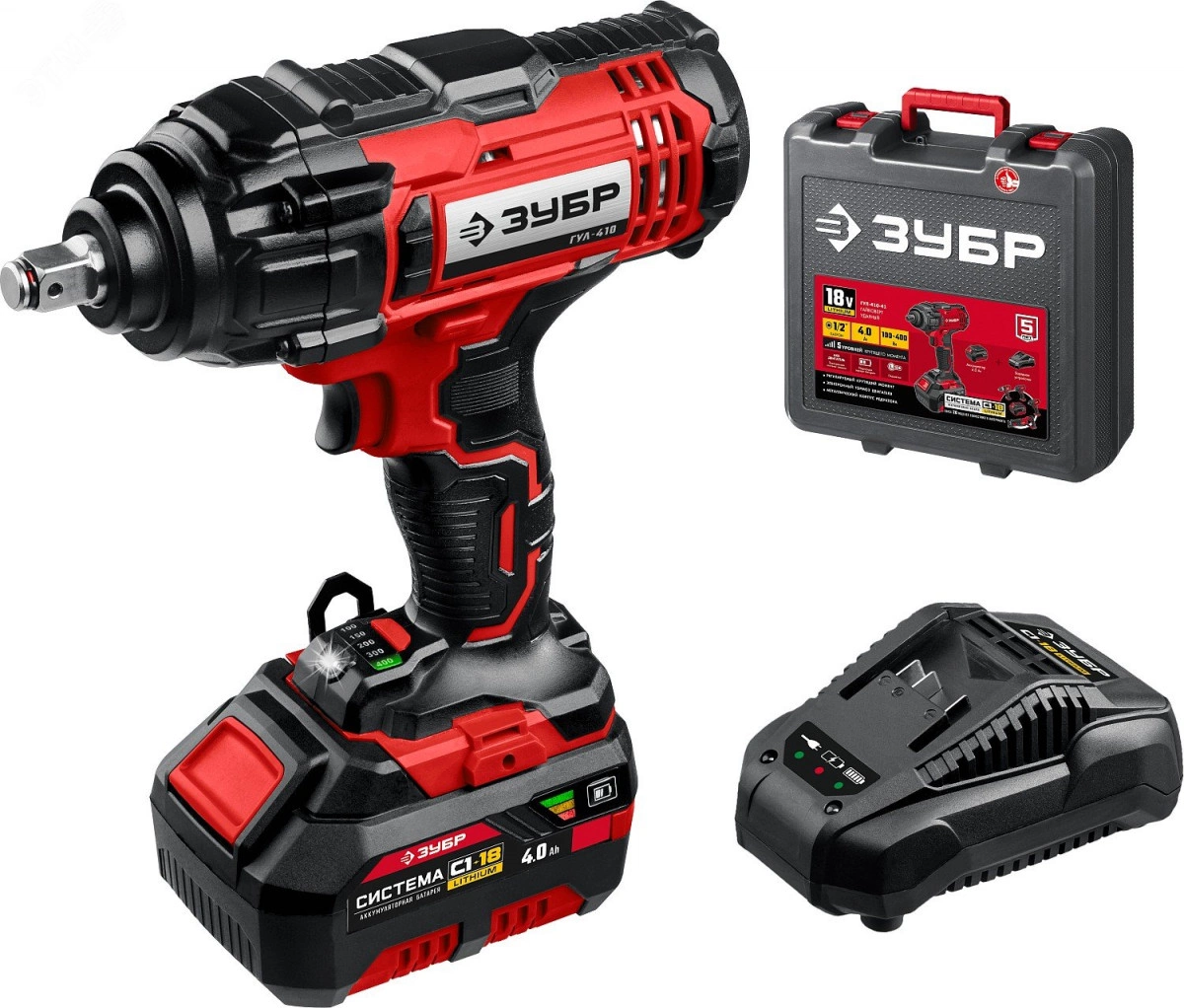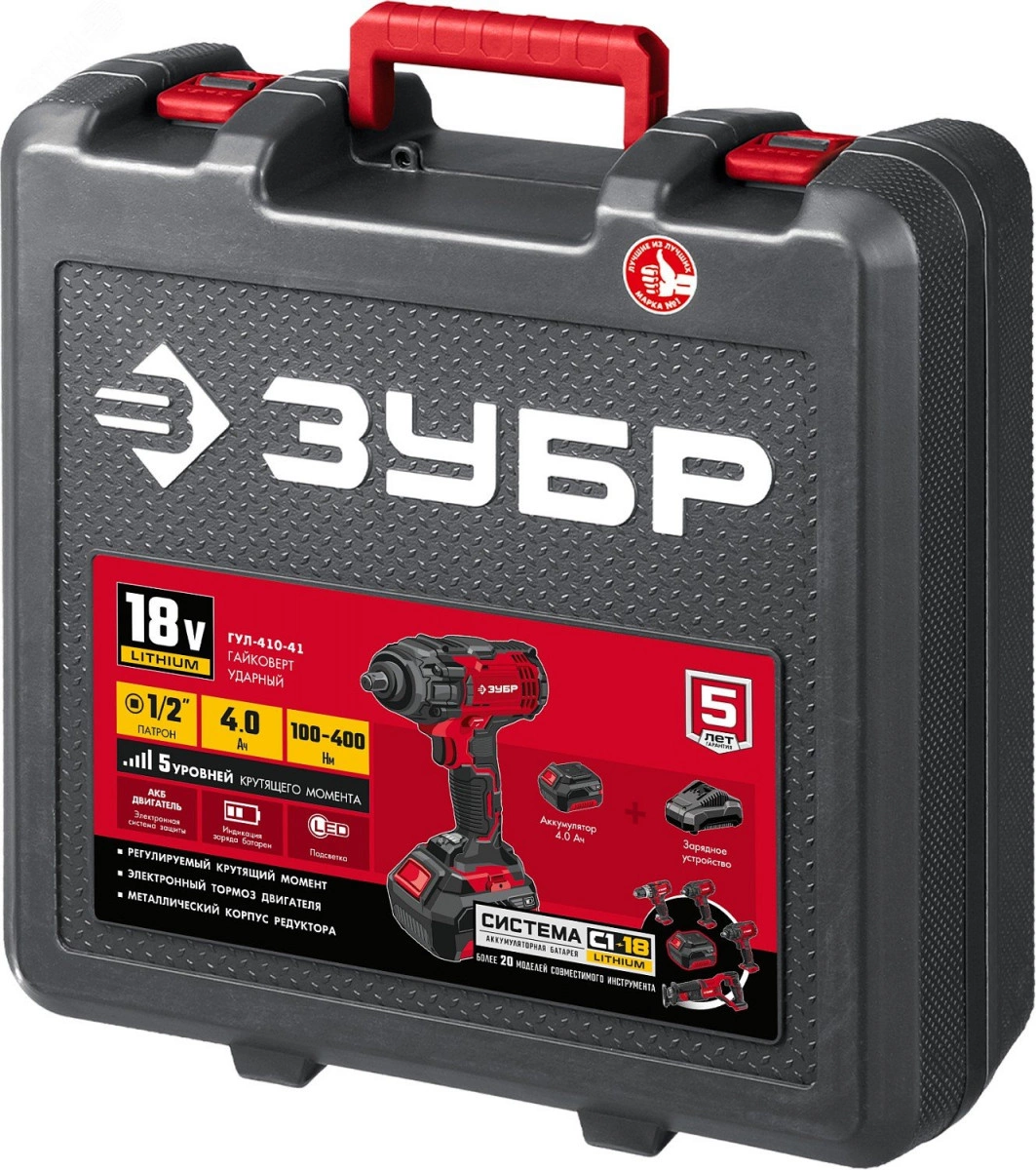 Незаменимый инструмент для автомобильной мастерской. Огромный крутящий момент для наиболее сложных работ. Ударная функция позволяет заворачивать крепеж большого диаметра и отворачивать приржавевшие метизы. Пять уровней регулировки предоставляют возможность настроить крутящий момент под предстоящую работу или используемый крепеж. Изменение настройки максимального момента в одно касание с наглядной индикацией. Аккумуляторная батарея емкостью 4.0 Ач для большей производительности. Литийионная технология ЗУБР нового поколения - увеличение производительности на 35%. Электронная система защиты от перегрузки, перегрева и глубокой разрядки. отсутствие эффекта памяти. Отсутствие потери мощности в процессе работы.