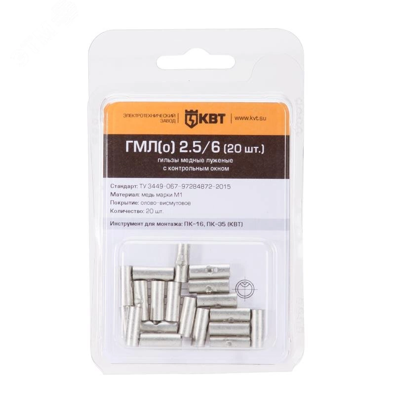 Гильза медная луженая с технологическим окном для контроля глубины захода жилы в мини-упаковке ГМЛ(о)-2.5/6 (20 шт.)