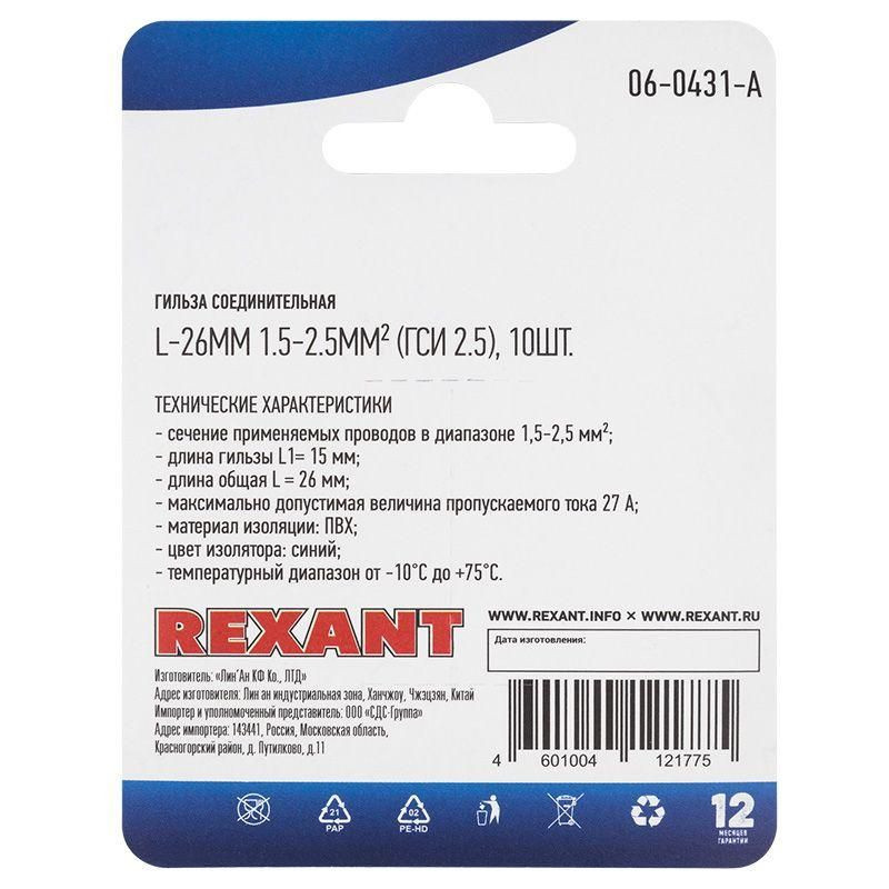 Полное описание: Гильза соединительная изолированная СГИ L-26мм 1.5-2.5кв.мм ГСИ 2.5/ГСИ 1.5-2.5/BV2 син. (блист.10шт) Rexant 06-0431-A