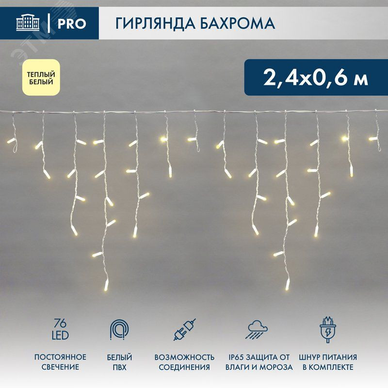Гирлянда ''Бахрома'' (''Айсикл'') представляет собой гибкий горизонтальный шнур-шину, к которому через определенные промежутки крепятся вертикальные нити разной длины со светодиодами. Она имитирует сосульки и может послужить эффектным и оригинальным решением при декорировании карнизов домов, арок, фасадов зданий, витрин магазинов, а также стать элементов декора внутренних интерьеров помещений. Благодаря использованюя в гирлянде светодиодов, ее отличительной особенностью является превосходная яркость и низкое энергопотрбление по сравнению с лампами накаливания. При длине 2,4 метра гибкая направляющая имеет 24 вертикальные нити от 20 до 60 см.Данная гирлянда предназначена для использования как внутри помещения, так и снаружи.