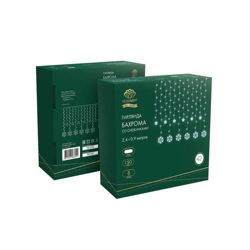 Полное описание: Гирлянда "Бахрома" со снежинками 2.4х0.9м 150 LED с контроллером 8 режимов 230В бел. Neon-Night 255-075