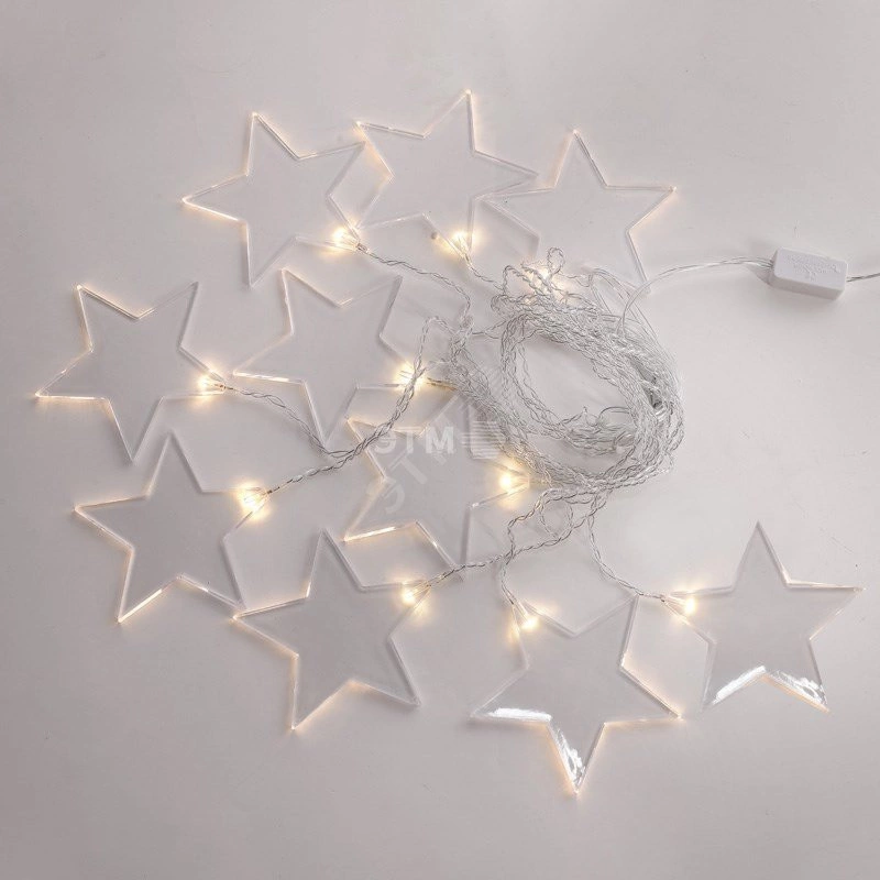 Гирлянда ''Звезды'' длиной 1,5 метра выполнена в виде бахромы. 10 диодов излучают белый свет теплого оттенка. Светодиоды не нагреваются, не вырабатывают вредный для зрения спектр и экономно потребляют электроэнергию. Вертикальные нити длиной 40 и 60 см удерживают 10 волшебных звезд размером 11,5 см. Гирлянда с ассиметричными нитями с защитой IP20 предназначена для использования в сухих отапливаемых помещениях и станет прекрасным украшением окна, арки, открытого дверного проема, свободного пространства между комнатами. Для подключения к розетке предусмотрен 3-метровый питающий шнур.