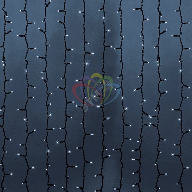 Гирлянда ''Светодиодный Дождь'' представляет собой гибкий горизонтальный шнур-шину (2м), к которому через определенные промежутки крепятся вертикальные нити (20 шт.) со светодиодными лампами, которые отличаются от ''Бахромы'' тем, что имеют одинаковую, достаточно значительную длину, часто превышающую протяженность шины. На концах каждой шины есть разъем и штепсель, которые предназначены для последовательного соединения нескольких световых дождей в большой занавес ПЛЕЙ-ЛАЙТ. Используя занавес, можно не только создавать красивые световые занавесы или оформлять различные плоскости, например, фасады домов, окна и т.д., но и украшать объемные объекты. Светодинамические эффекты становятся доступными только при подключении гирлянды к сети через специальный контроллер.