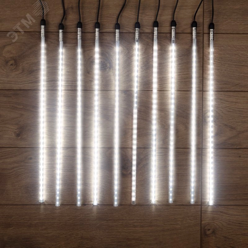 Светодиодная гирлянда ''Тающие сосульки'' — это оригинальное, красивое и современное средство оформления фасадов и интерьеров зданий, деревьев, витрин и т. д. Она представляет собой комплект из 10 прозрачных пластиковых трубок, расположенных на расстоянии 100 см друг от друга. По всей длине каждой трубки внутри надежно закреплена плата со светодиодами и микрочипом, обеспечивающим динамику с эффектом стекающей капли. Длина каждой трубки 50 см.