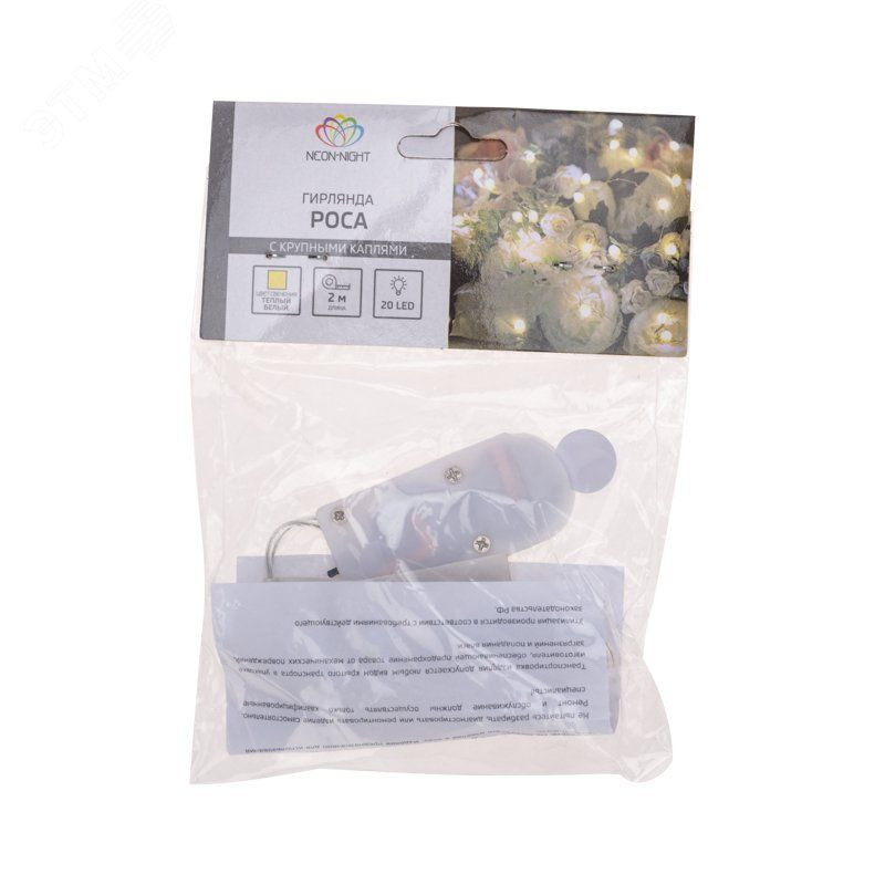 Светодиодная гирлянда ''Роса'' с красивыми крупными каплями – прекрасный декоративный элемент, светящийся разными огоньками и создающий атмосферу праздника и уюта. Это отличный способ акцентировать внимание на отдельных предметах интерьера, создать неповторимый арт-объект или использовать в качестве дополнительной подсветки. Гирлянда может эффектно подчеркнуть красоту картины, вазы с цветами, статуэтки или украсить небольшую елочку. Часто ''Роса'' украшает не только интерьер, но и с успехом применяется на торговых площадках и ярмарках для привлечения внимания к продукции. Отличительной особенностью данной гирлянды являются более крупные диоды. В качестве питания у данной модели гирлянды выступают батарейки 2хСR2032, которые идут в комплекте.