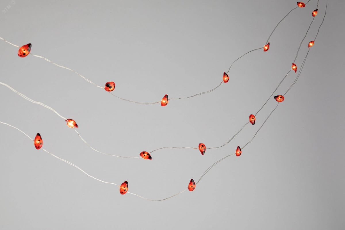 Садовая гирлянда Божьи коровки на солнечной батарее 7м (длина рабочей части 5 метров) 2 режима 25 LED ЭРА ERASF23-19. В дневное время гирлянда подзаряжается естественным способом с помощью встроенной солнечной батареи, вечером автоматически включается, создаёт яркую дополнительную подсветку и красивый световой узор.