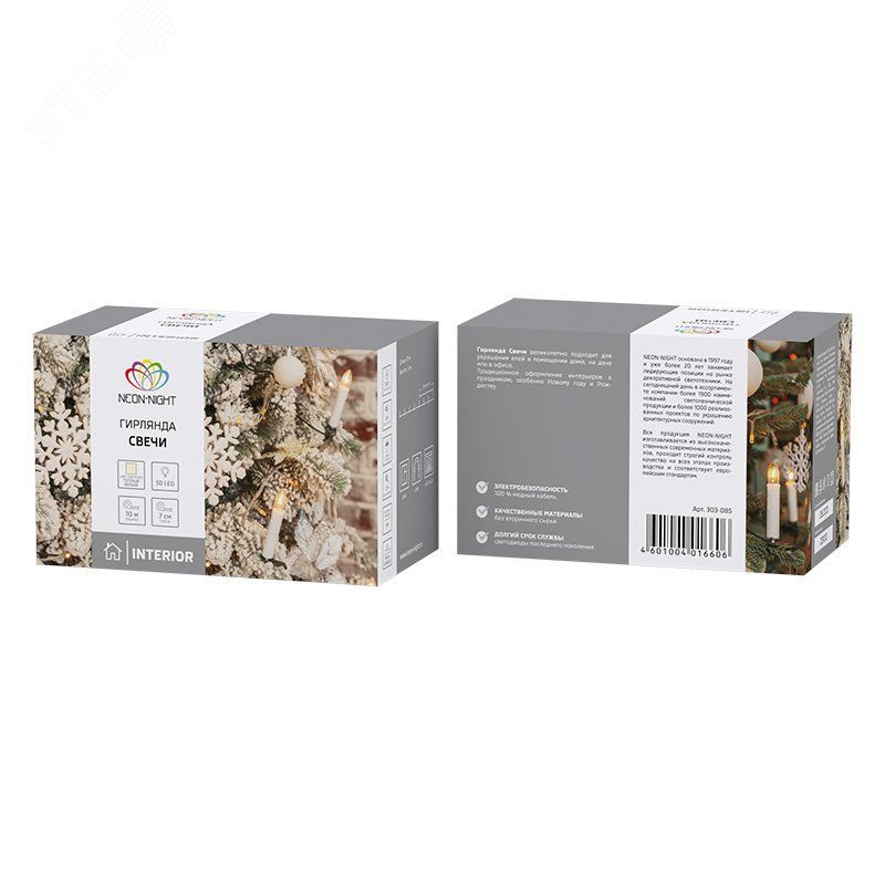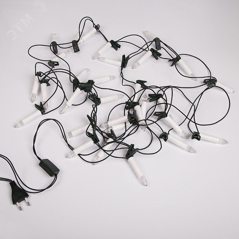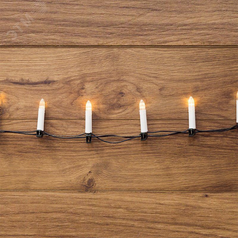 Гирлянда ''Свечи'' длиной 10 метров — это настоящий символ Рождественских праздников, который станет оригинальным украшением ели, создаст атмосферу уюта и ощущение волшебства. 50 диодов располагаются в фигурках в виде свечек, которые излучают теплый белый свет и имитируют пламя. Элементы находятся на проводе, защищенном изоляцией из темно-зеленого ПВХ, и сопровождаются клипсами-фиксаторами. Небольшие пластиковые зажимы помогают закрепить фигурки на ветвях новогодней елки в нужном положении. Зеленый шнур отлично маскируется в кроне, оставляя на виду только горящие свечи. Для подключения в розетку не требуется удлинитель - длина питающего шнура 3 метра.