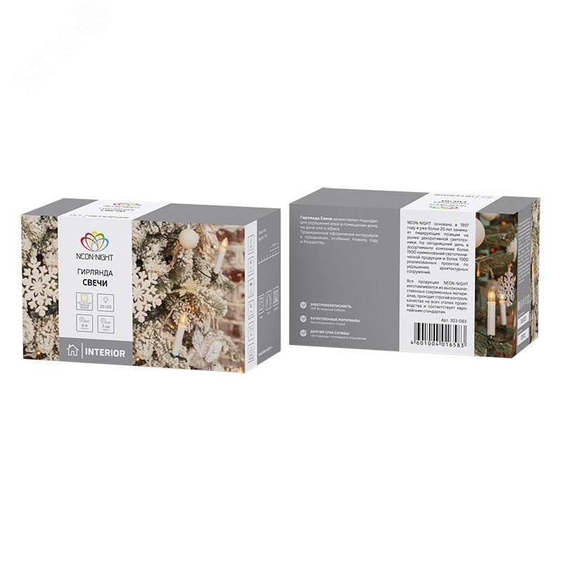 Гирлянда ''Свечи'' выполнена в виде провода в изоляционной оболочке из темно-зеленого ПВХ длиной 4 метра, на котором расположены 20 фигур в виде свечей со светодиодами, размер свечи — 7 см. Диоды излучают белый свет теплого оттенка, имитирующий пламя на кончике фитиля. Каждая свечка сопровождается пластмассовой клипсой-прищепкой, которая позволяет закрепить фигурки на ветках новогодней ели в нужном положении. Для подключения в розетку в любом удобном месте предусмотрен трехметровый электрический кабель. Гирлянда светится в постоянном режиме.