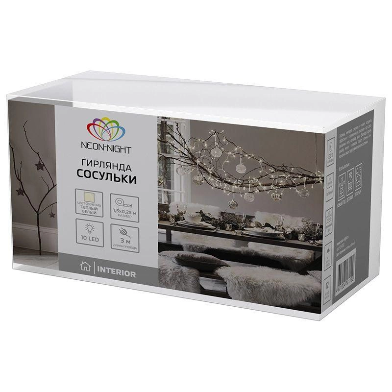 Полное описание: Гирлянда светодиодная "Айсикл" (бахрома) "Сосульки" 1.5х0.25м 10LED тепл. бел. 0.51Вт IP20 провод прозр. Neon-Night 303-067