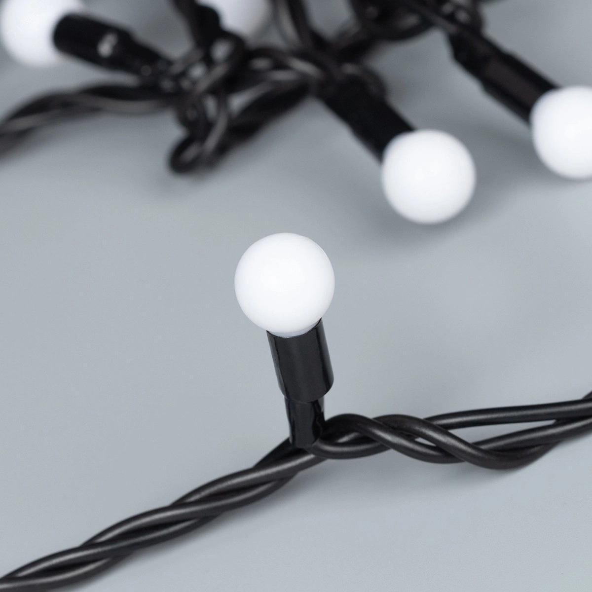 Светодиодная гирлянда ШАРИКИ серии CLASSIC. Размер 5000 мм. Цвет светодиодов RGBY, эффект динамики (автоматическая быстрая смена цвета свечения). Провод из чёрного ПВХ, диаметр 2.3 мм. 50 шариков со светодиодом внутри размером 13 мм, молочно-белого цвета. Напряжение питания 230 В, потребляемая мощность 3.5 Вт, степень пылевлагозащиты IP65. Аксессуар для подключения в комплекте.