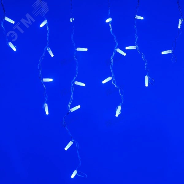 Светодиодная гирлянда БАХРОМА серии CLASSIC. Размер 2400x600 (длина 2400 мм, высота 600 мм). Цвет светодиодов СИНИЙ, эффект мерцания 180-200 вспышек в минуту, цвет мерцающих светодиодов БЕЛЫЙ (6000 К). Провод из белого ПВХ, диаметр 2.3 мм, 24 ниспадающие нити длиной от 200 до 600 мм. 88 светодиодов размером 7 мм, прозрачный вогнутый колпачок. Напряжение питания 230 В, потребляемая мощность 6 Вт, степень пылевлагозащиты IP65. Для эксплуатации необходимо приобрести аксессуар для подключения.