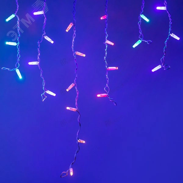 Светодиодная гирлянда БАХРОМА серии CLASSIC. Размер 2400x600 (длина 2400 мм, высота 600 мм). Цвет светодиодов RGBY (цвет светодиодов чередуется). Провод из белого ПВХ, диаметр 2.3 мм, 24 ниспадающие нити длиной от 200 до 600 мм. 88 светодиодов размером 7 мм, прозрачный вогнутый колпачок. Напряжение питания 230 В, потребляемая мощность 6 Вт, степень пылевлагозащиты IP65. Для эксплуатации и выбора динамического режима необходимо приобрести аксессуар для подключения.