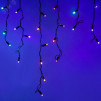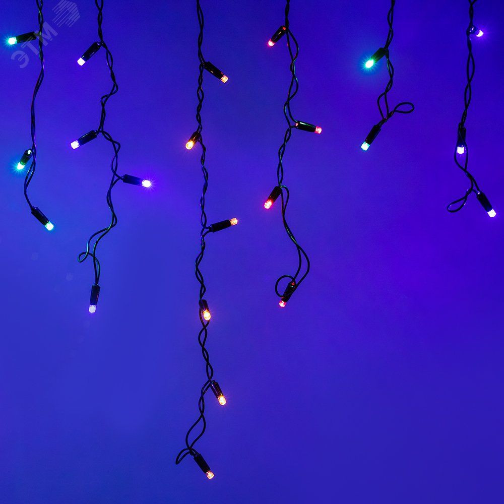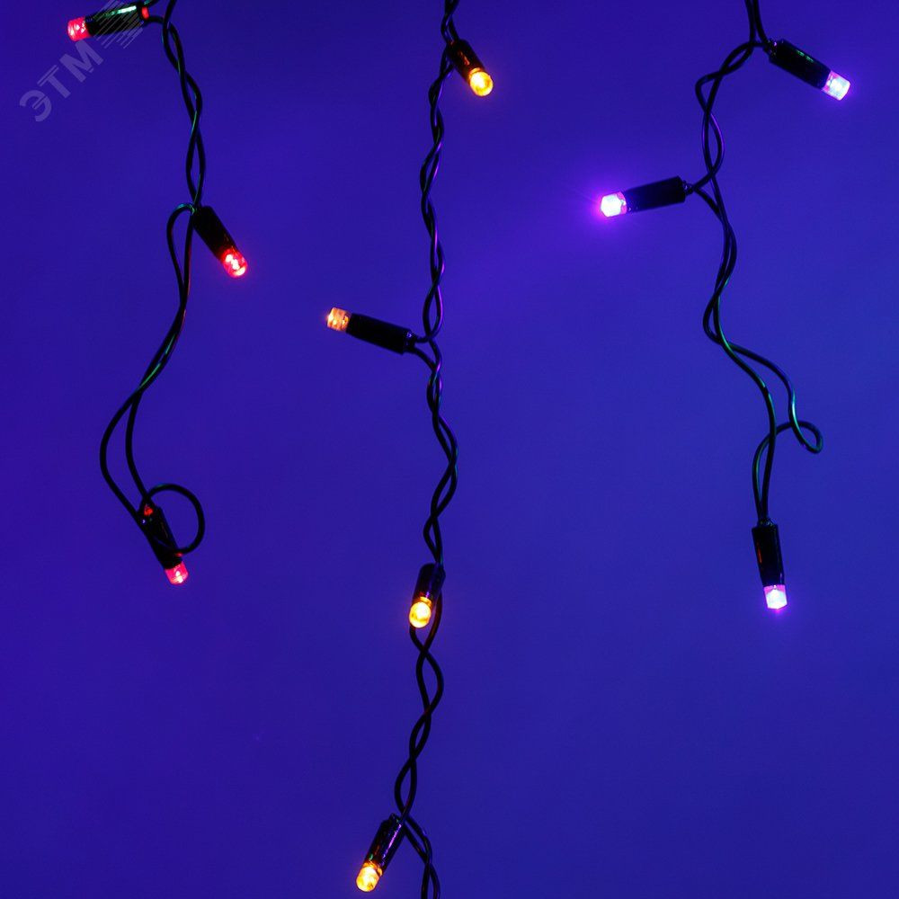 Светодиодная гирлянда БАХРОМА серии CLASSIC. Размер 2400x600 (длина 2400 мм, высота 600 мм). Цвет светодиодов RGBY (цвет светодиодов чередуется). Провод из чёрного ПВХ, диаметр 2.3 мм, 24 ниспадающие нити длиной от 200 до 600 мм. 88 светодиодов размером 7 мм, прозрачный вогнутый колпачок. Напряжение питания 230 В, потребляемая мощность 6 Вт, степень пылевлагозащиты IP65. Для эксплуатации и выбора динамического режима необходимо приобрести аксессуар для подключения.