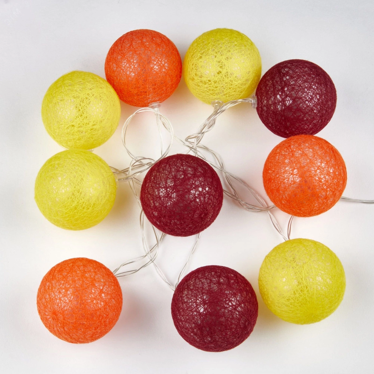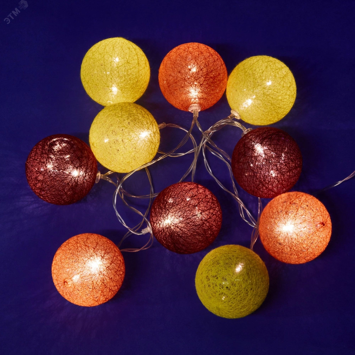 Гирлянда светодиодная клубки на батарейках. Гирлянда с теплым белым свечением, незаменима для декоративной подсветки и украшения интерьера, легко монтируется. Светодиодная гирлянда длиной 1,35 метра, имеет 10 светодиодов, диаметром 5,5 сантиметра, предназначена для использования в помещениях. Отличительной особенностью гирлянды является превосходная яркость и низкое энергопотребление. Сетевой кабель длиной 0,5 метра. Цвет провода - прозрачный. Поставляется в картонной упаковке. Срок службы составляет 30000 часов. Гарантия производителя 12 месяцев. Элемент питания батарейки типа АА, в комплект не входят.
