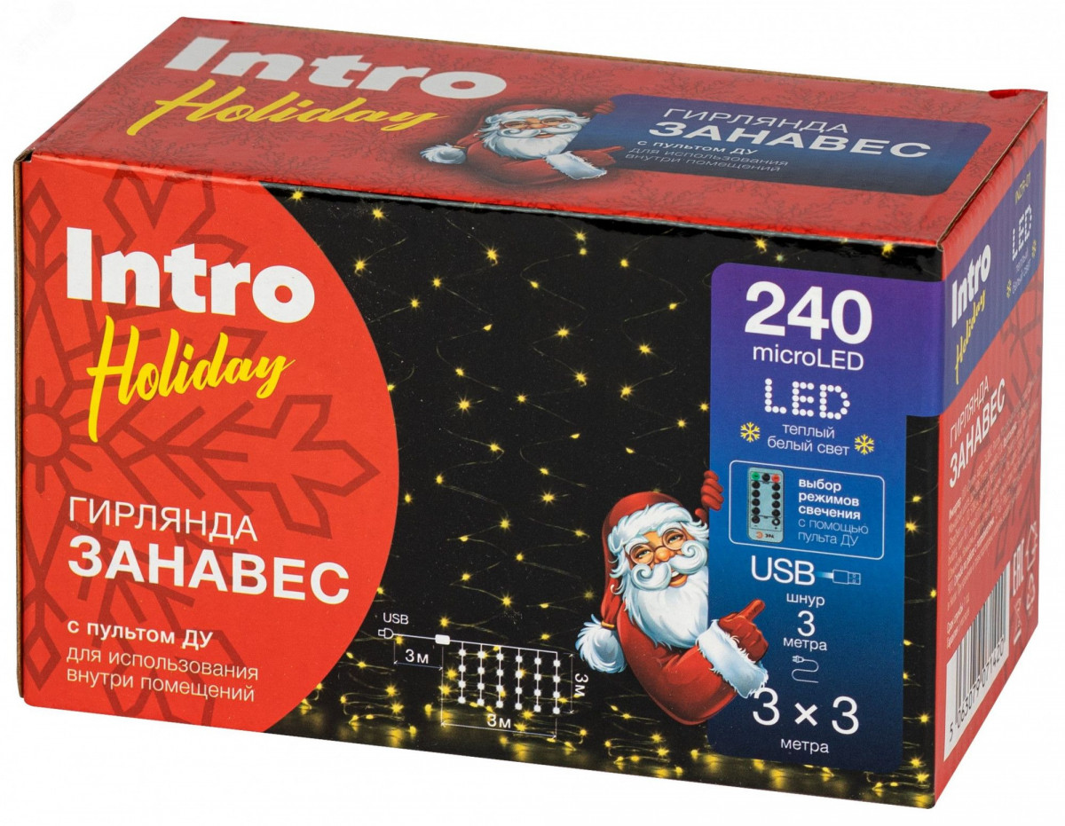Полное описание: Гирлянда светодиодная новогодняя занавес 3х3 м теплый белый 240 microled USB Intro Holiday INZR-01