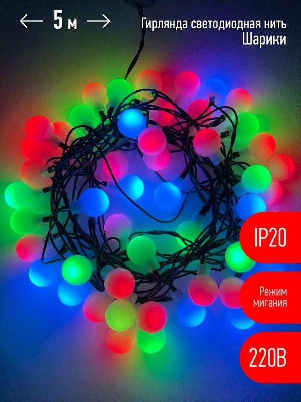 Гирлянда светодиодная "Нить Шарики" d18мм 5м 50LED 220В IP20 мультиколор ЭРА Б0047968