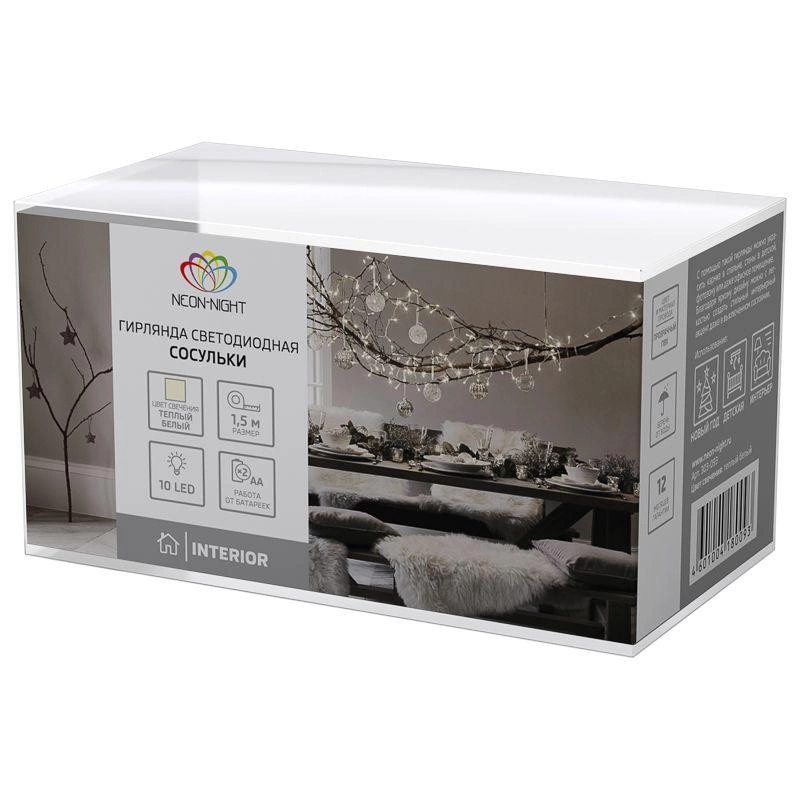 Полное описание: Гирлянда светодиодная "Сосульки" 1.5м 10LED тепл. бел. 0.1Вт IP20 провод прозр. ПВХ элементы питания 2хAA (не в компл.) Neon-Night 303-093