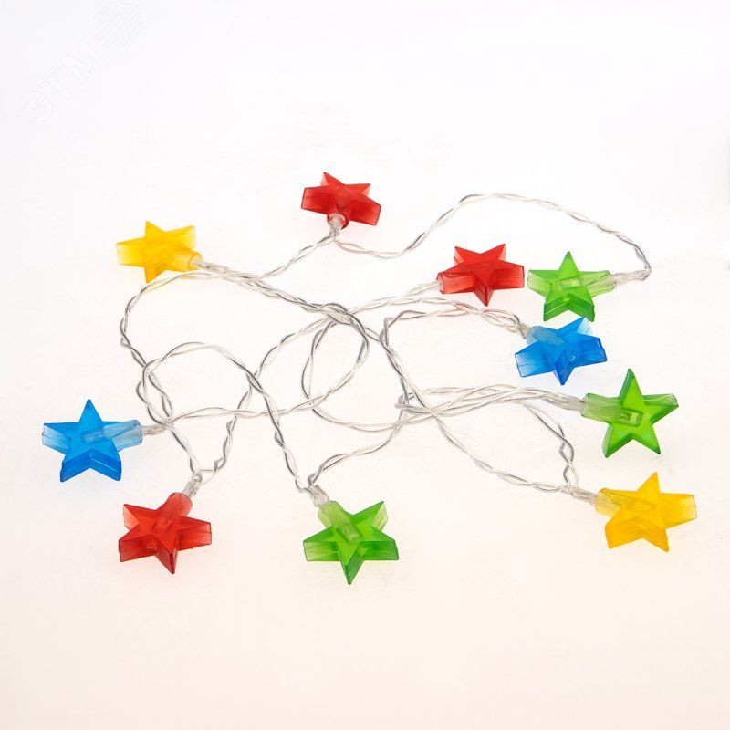 Светодиодная гирлянда ''Звездочки'' длиной 1,5 — оригинальное и эффектное украшение, которое подойдет для оформления как новогодней ели, так и отдельных предметов интерьера - гардин, ваз, скульптур, элементов мебели. Насадки, в виде матовых разноцветных звездочек, расположены по всей длине провода и подсвечиваются 10 разноцветными диодами, питающимися от двух батареек типа АА. Гирлянда выполняет роль акцентной подсветки в отапливаемых помещениях со стандартными условиями влажности и температуры.