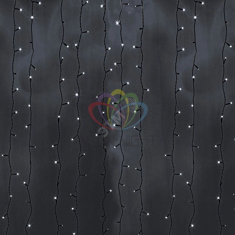 Гирлянда ''Светодиодный Дождь'' представляет собой гибкий горизонтальный шнур-шину (2м), к которому через определенные промежутки крепятся вертикальные нити (16 шт.) со светодиодными лампами, которые отличаются от ''Бахромы'' тем, что имеют одинаковую, достаточно значительную длину, часто превышающую протяженность шины. На концах каждой шины есть разъем и штепсель, которые предназначены для последовательного соединения нескольких световых дождей в большой занавес ПЛЕЙ-ЛАЙТ. Используя занавес, можно не только создавать красивые световые занавесы или оформлять различные плоскости, например, фасады домов, окна и т.д., но и украшать объемные объекты.