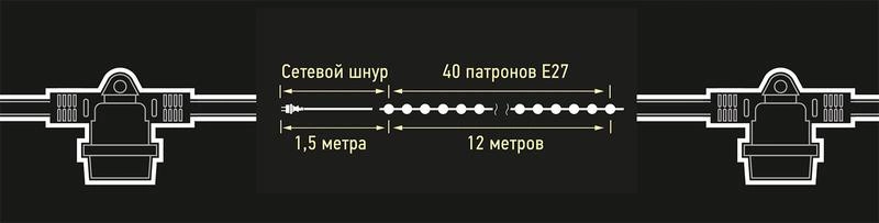 Гирлянда уличная Белт-лайт PBL-S40/L12+1.5 Black E27 IP65 (12м/40ламп/1.5м шнур) соединение в линию max750Вт (лампы в комплект не входят) JazzWay 5040564