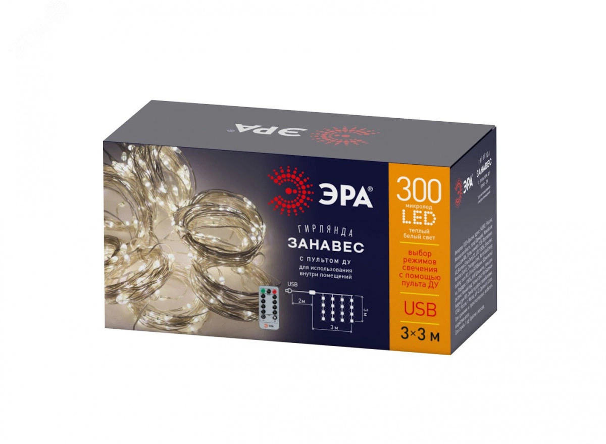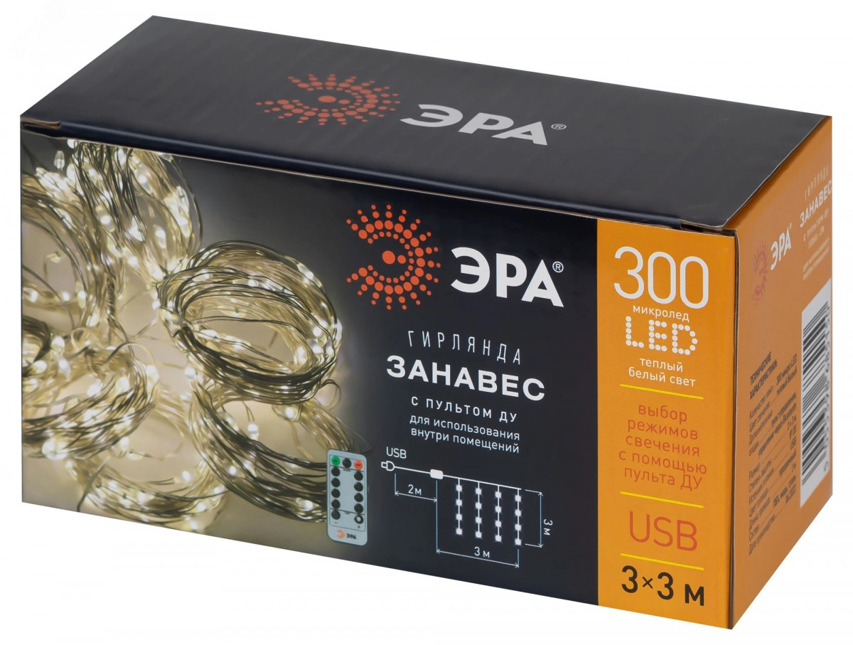Гирлянда Занавес с пультом, теплый белый, 300 LED, 3*3 м, с пультом, USB, 220 V, IP20 ЕGNIG - ZW ЭРА