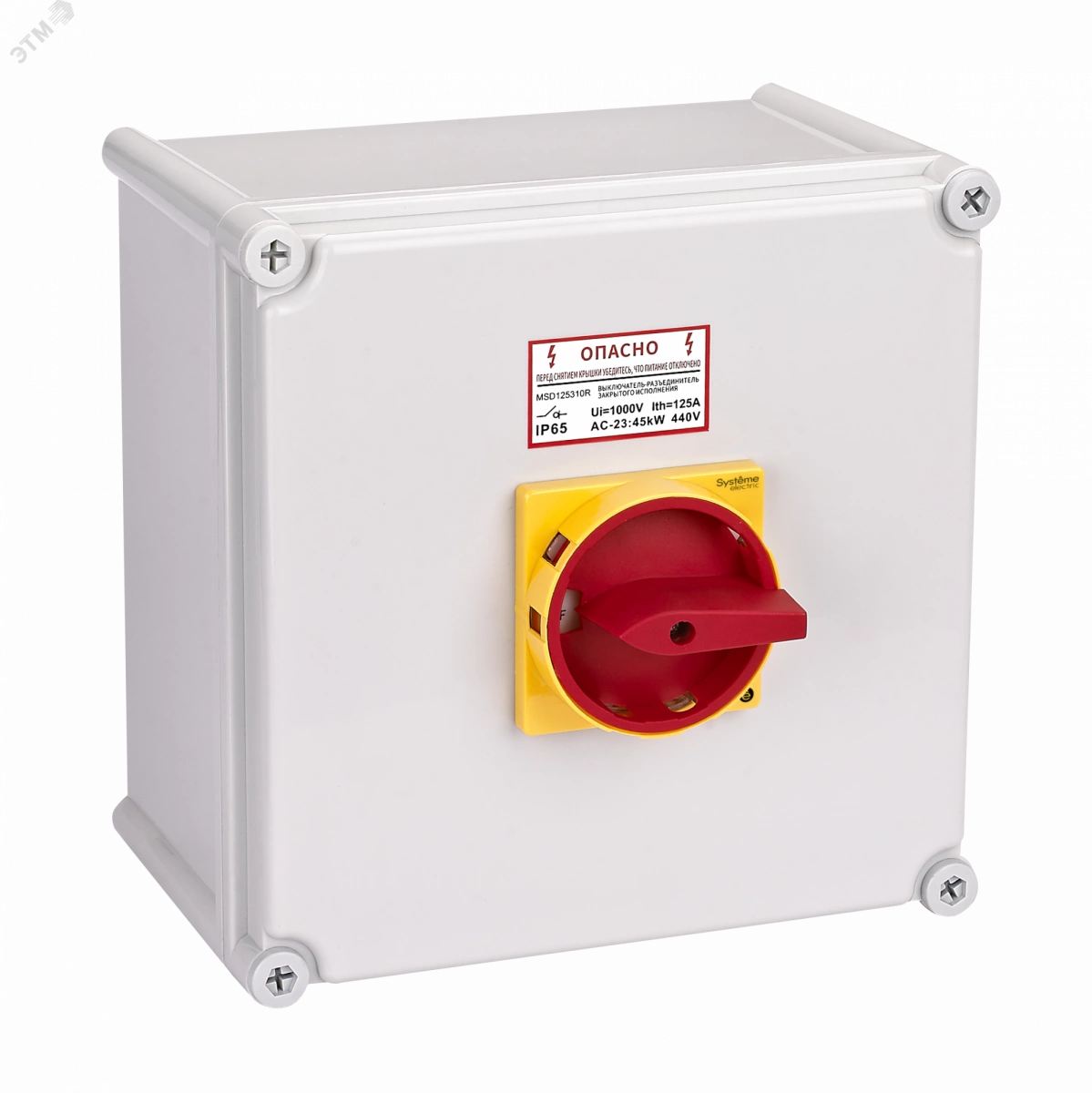 Выключатель-разъединитель MSD в корпусе IP65 на номинальный ток 175 А. Может использоваться в качестве главного аварийного выключателя. Применяется для коммутации силовых электрических цепей активной, индуктивной или смешанной нагрузок, может использоваться для включения и отключения двигателей категорий применения AC–3 и DC–3. 3-полюсное исполнение, красная поворотная рукоятка с возможностью блокировки навесными замками.