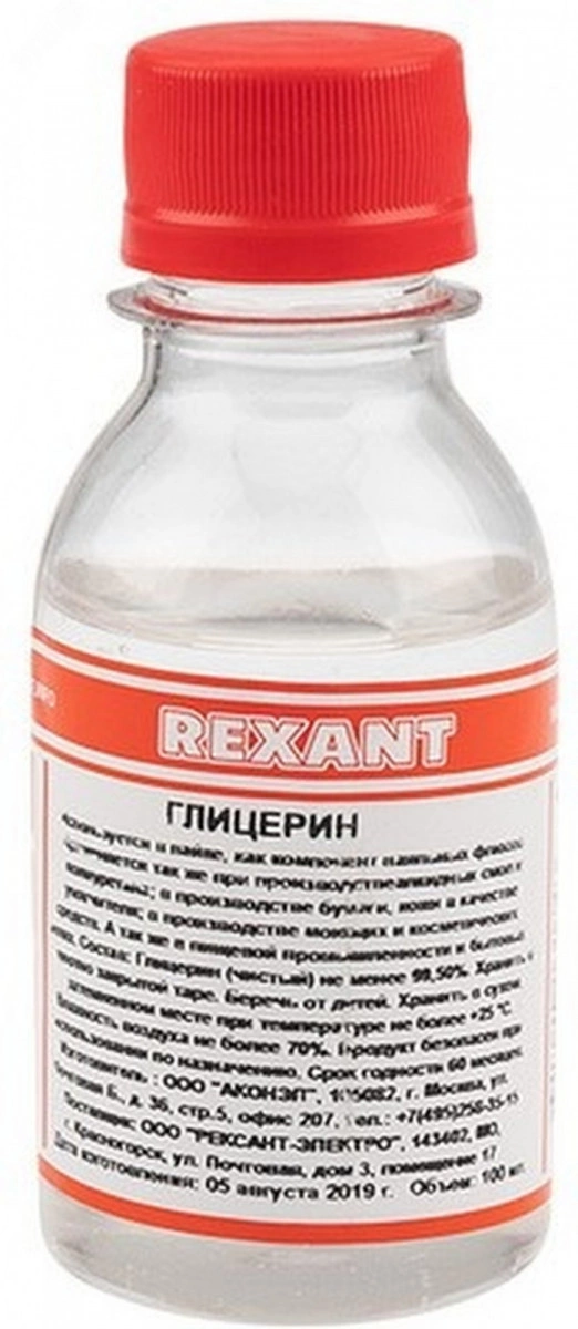 Глицерин 100 мл REXANT — бесцветная, вязкая и очень гигроскопичная жидкость. Смешивается с водой в любых пропорциях. Сладкая на вкус. В производстве алкидных смол, полиуретана и акролеина. В табачном производстве в качестве увлажнителя табака. В бумажной и кожевенной отраслях промышленности в качестве умягчителя тканей, кожи и бумаги. В медицинской промышленности. В производстве моющих, косметических средств и парфюмерных препаратах как регулятор влажности. В пищевой промышленности. В электротехнике и радиотехнике.