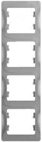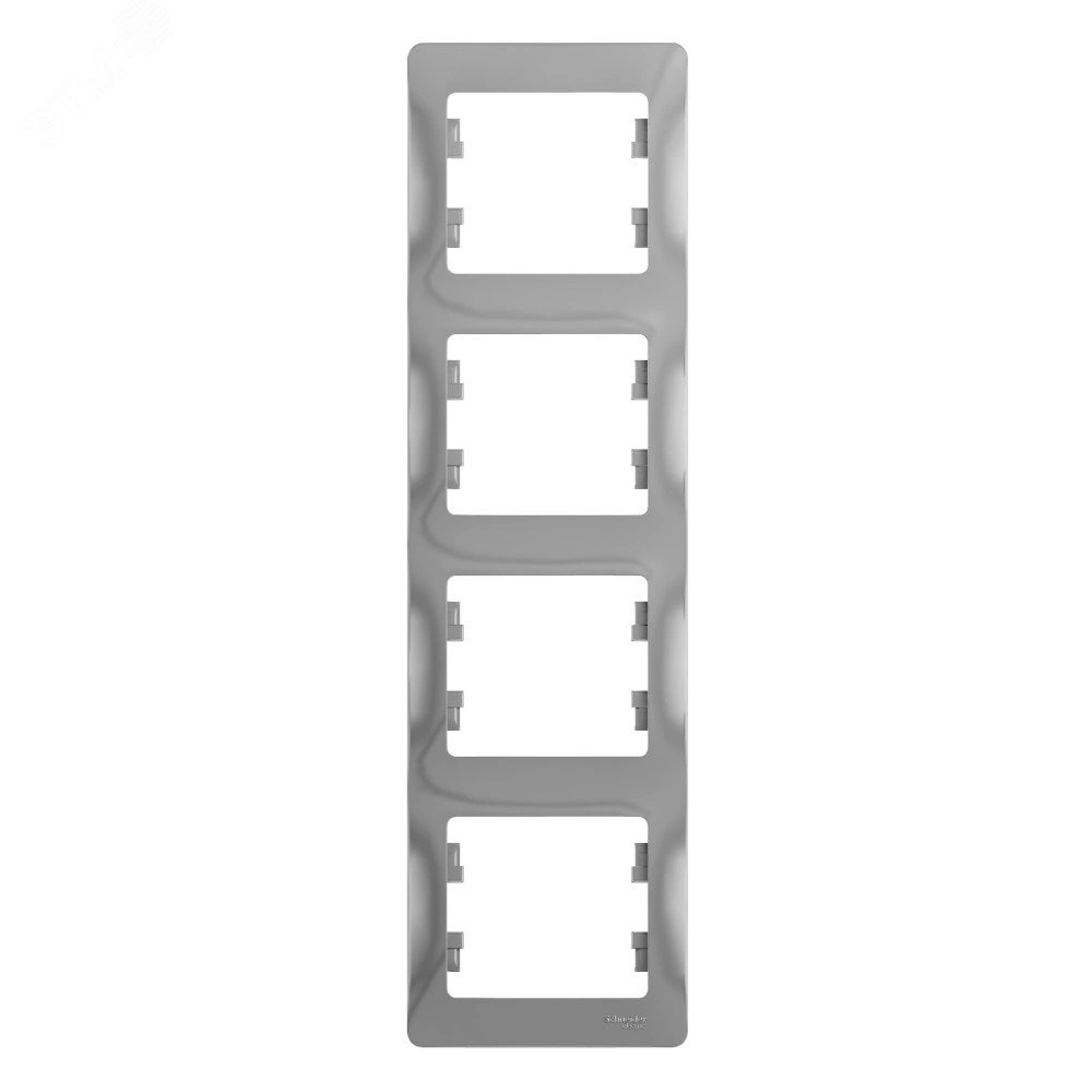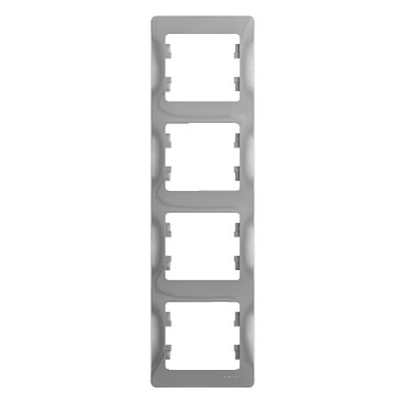 Рамка Systeme Electric (ранее Schneider Electric) серии Glossa (цвет алюминий) четырёхместная. Устанавливается в вертикальном положении. Выполнена из материала PС+ASA, стойкого к УФ-излучению и появлению царапин. Позволяет гармонично вписать электроустановочное изделие в интерьер помещения.