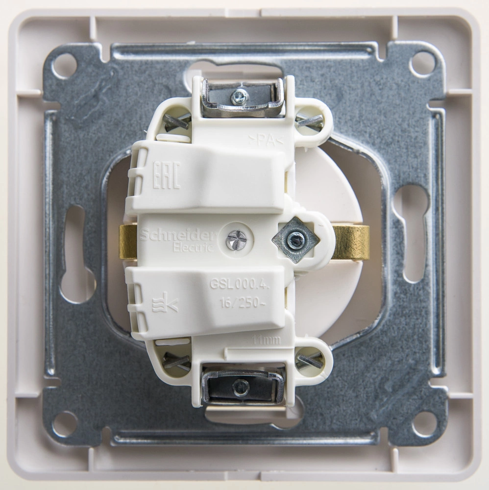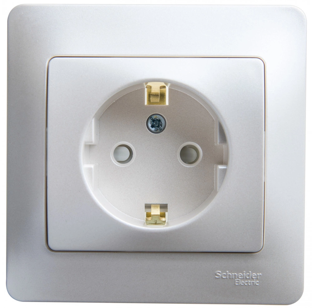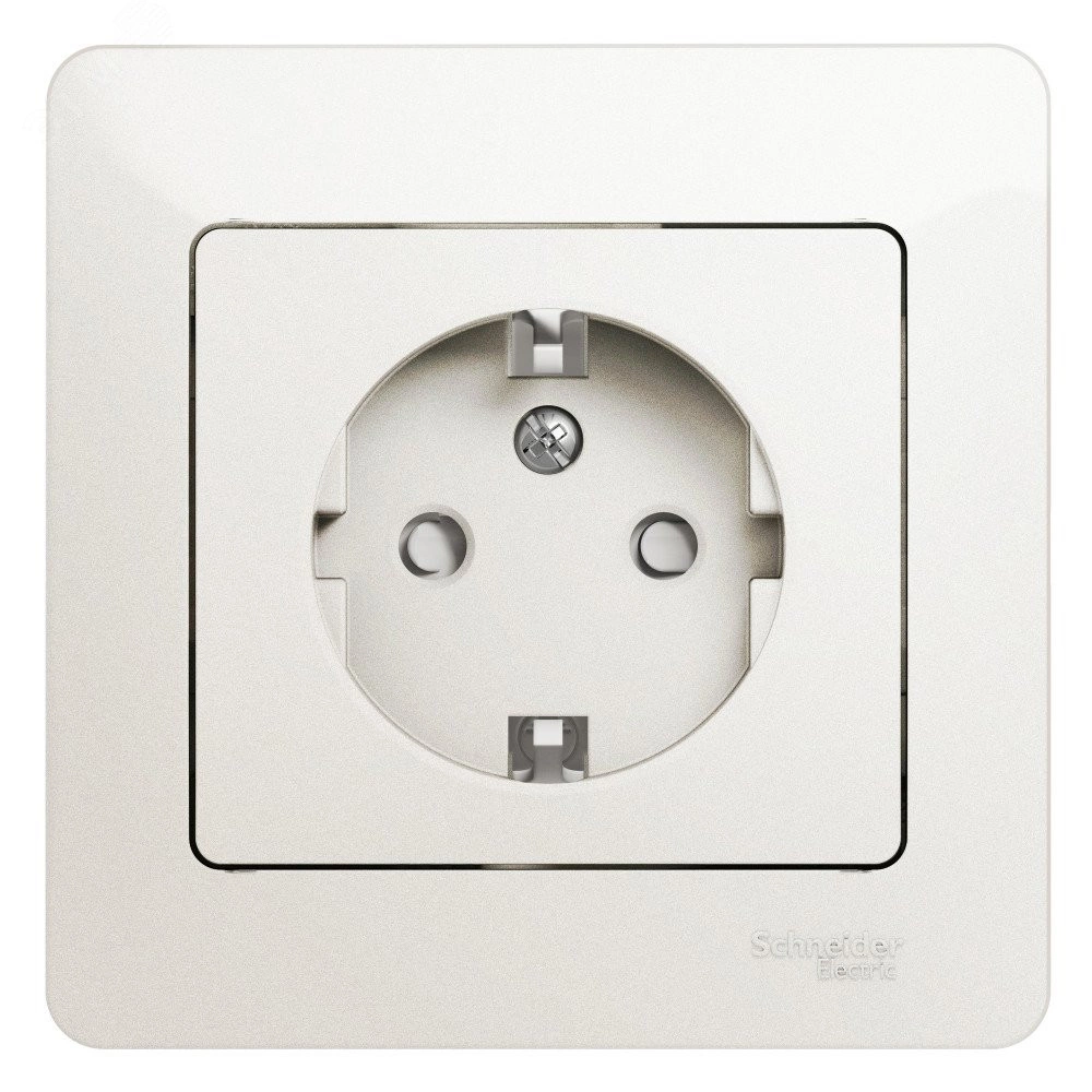 Розетка Systeme Electric (ранее Schneider Electric) серии Glossa (в сборе, цвет перламутр) одинарная с заземлением и без шторок подходит для сетей 250 В, на ток 16 А. Заземляющий контакт обеспечивает дополнительную защиту от удара электрическим током. При наличии заземления электрический потенциал уходит в землю, защищая человека. Выполнен из материала PС+ASA, стойкого к УФ-излучению и появлению царапин. Эргономичные клеммы розеток расположены в один ряд.