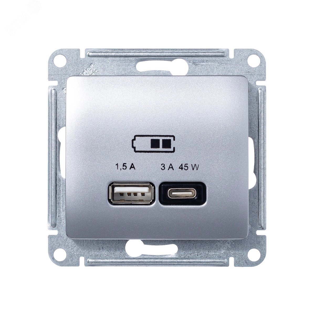 Розетка Systeme Electric серии Glossa (цвет алюминий) двойная USB с разъемами типа A плюс C высокоскоростная. Самая современная USB-зарядка с двумя разъемами позволяет заряжать как стандартные мобильные устройства через разъем типа А, так и новейшие устройства с разъемом типа С. Позволяет заряжать смартфоны последнего поколения, которые поддерживают функцию быстрой зарядки. Мощность, тип-A – 7.5 Вт, тип-С - 45Вт. Поддерживает современные протоколы быстрой зарядки QC, PD, последних версий. Лицевые детали из качественного ABS-пластика, устойчивого к царапинам и УФ-излучению.