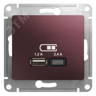 Розетка Schneider Electric Glossa (цвет баклажановый) двойная USB с разъемами типа A+C. Выполнена из материала PС+ASA, стойкого к УФ-излучению и появлению царапин. Самая современная USB-зарядка с двумя разъемами позволяет заряжать как стандартные мобильные устройства через разъем типа А, так и новейшие устройства, в том числе ноутбуки, с разъемом типа С.