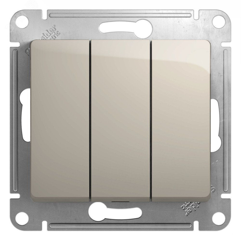 Механизм Systeme Electric (ранее Schneider Electric) серии Glossa (цвет молочный) выключателя 3-клавишного подходит для сетей 250 В, на ток 10 А. Трёхклавишный выключатель позволяет управлять тремя источниками света из одной точки. Выполнен из материала PС+ASA, стойкого к УФ-излучению и появлению царапин. Эргономичные клеммы расположены в два ряда - сверху и снизу.