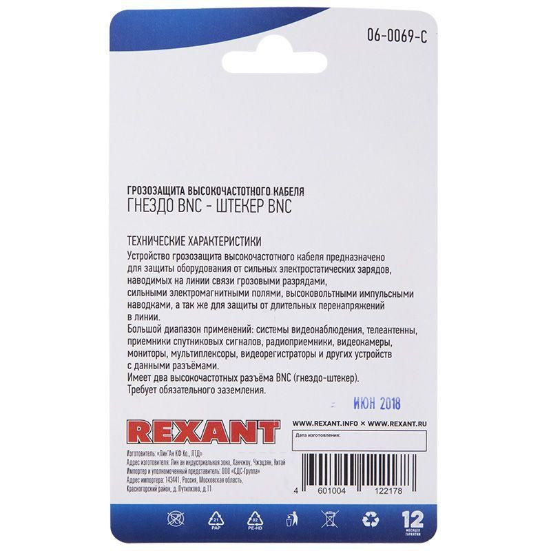 Грозозащита высокочастотного кабеля (гнездо BNC-штекер BNC) (блист.) Rexant 06-0069-C