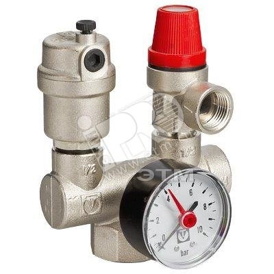 Комплектная группа безопасности для оснащения котлов и бойлеров систем автономного отопления, ГВС. Применяется в установках с тепловой мощностью до 44 кВт (определяется штатным предохранительным клапаном), номинальным давлением не выше 10 бар, рабочей температурой не более 120 градусов. Допустимая рабочая среда - пар, вода, незамерзающий теплоноситель (максимальное содержание гликолей - 50 процентов). Состав изделия - предохранительный клапан (настройка - фиксированная, 3 бара), автоматический воздухоотводчик, манометр, латунный никелированный корпус. Предусмотрен резьбовой патрубок для подключения расширительного бака (диаметр – 3/4''). Группа безопасности котла монтируется на выходе теплогенератора. Резьба присоединения - внутренняя, 1''.