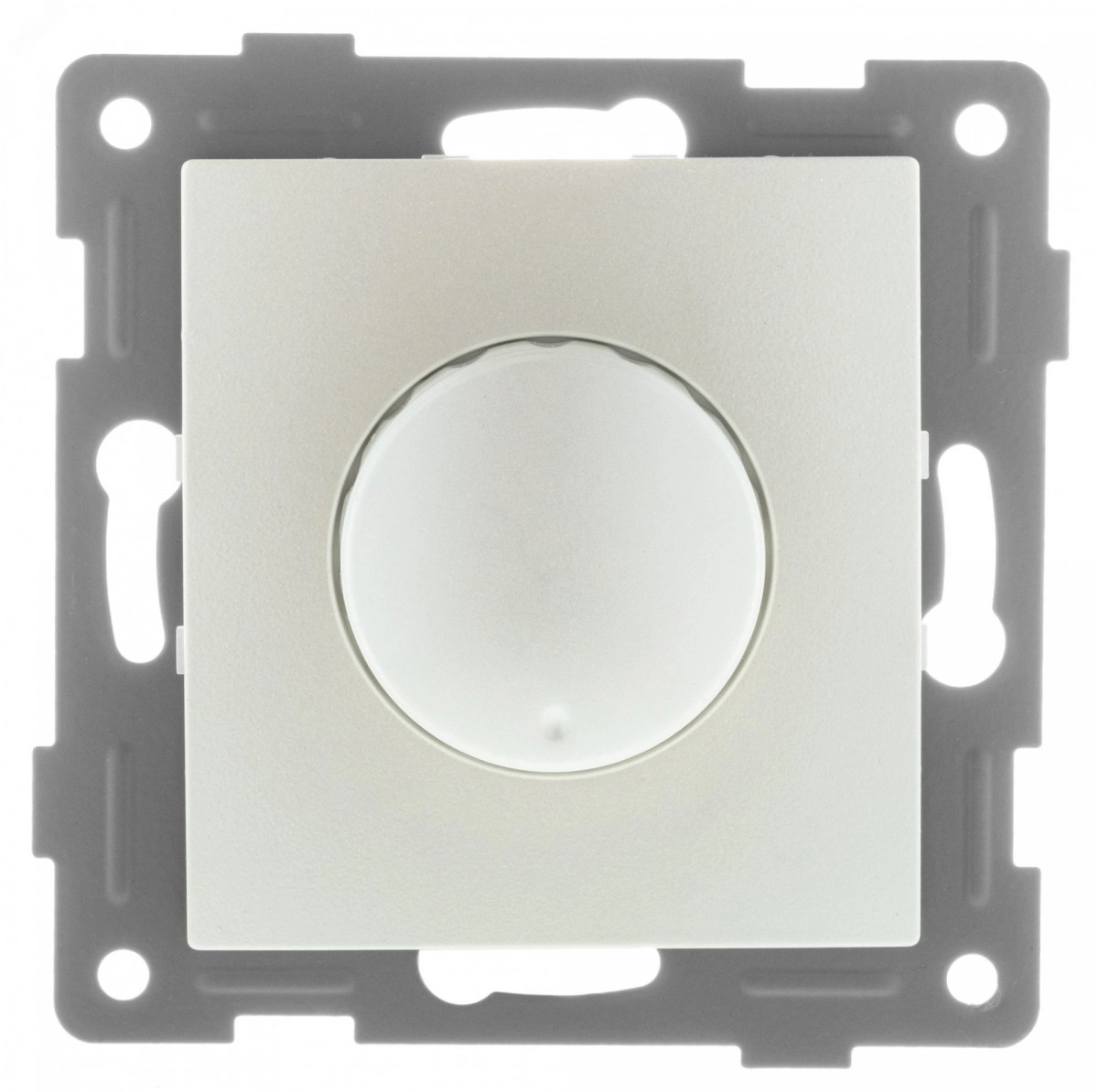Механизм диммера предназначен для коммутации и регулирования яркости ламп накаливания и галогеновых ламп. При повороте ручки регулятора происходит регулирование, в крайнем левом положении выключение. Устанавливается в монтажные коробки или специальные монтажные полости при скрытой проводке электрических сетей. Диммер позволяет производить монтаж, как при помощи распорных лапок, так и на резьбовые элементы в монтажной коробке.