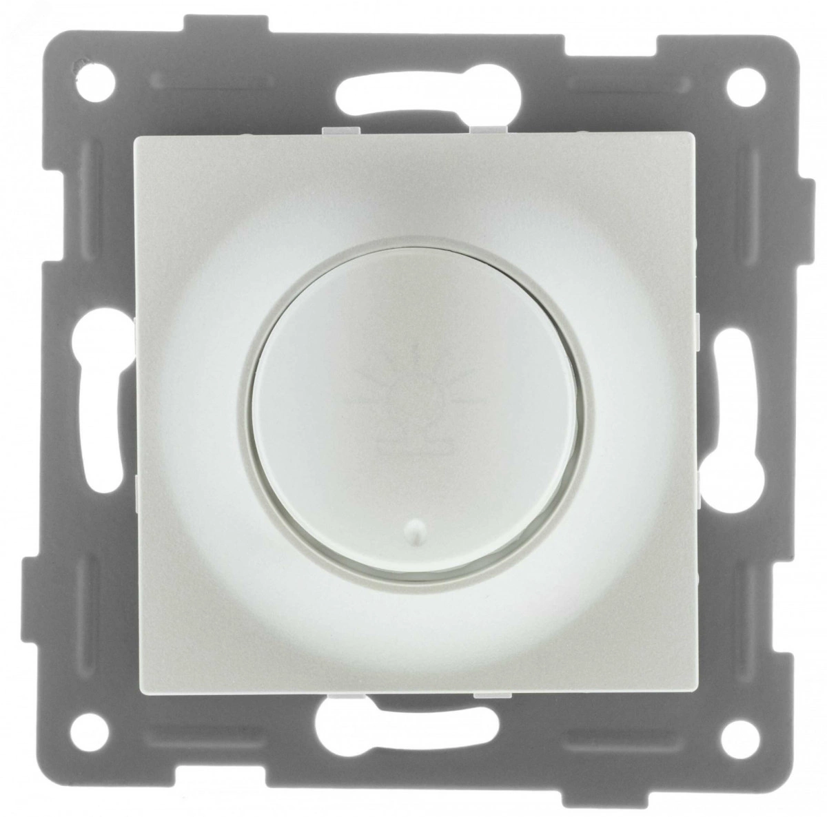 Механизм диммера предназначен для коммутации и регулирования яркости ламп накаливания и галогеновых ламп. При повороте ручки регулятора происходит регулирование, в крайнем левом положении выключение. Устанавливается в монтажные коробки или специальные монтажные полости при скрытой проводке электрических сетей. Диммер позволяет производить монтаж, как при помощи распорных лапок, так и на резьбовые элементы в монтажной коробке.