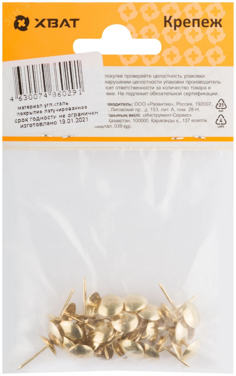 Латунированные. Предназначены для крепления задних стенок из ДВП и МДФ в корпусной мебели. Имеют большую грибовидную декоративную шляпку, позволяющую использовать их при обивке мебели, дверей и т.д.