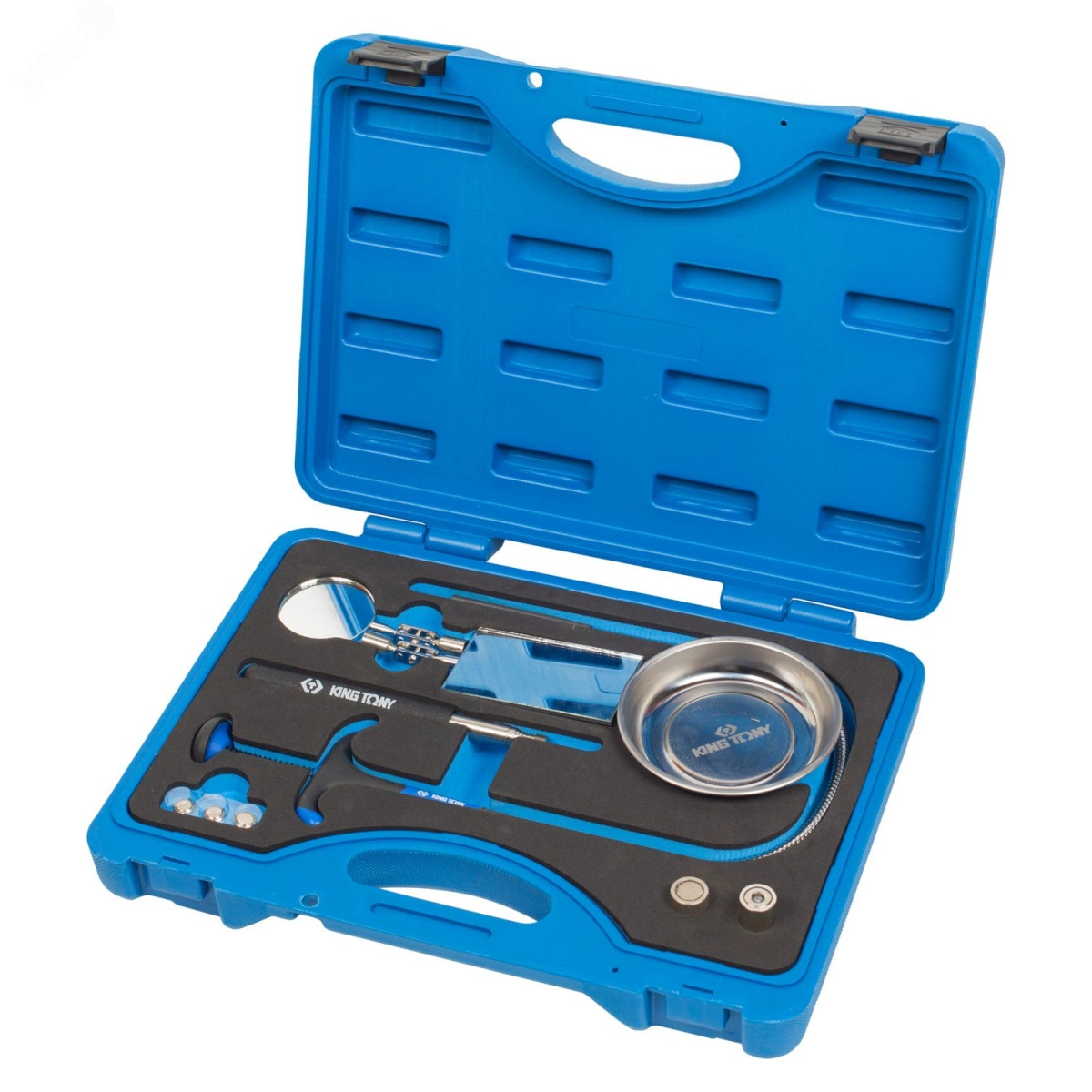 Инспекционный набор KING TONY 9TQ01. Любой ремонт невозможно представить без сопутствующих аксессуаров и приспособлений, которые помогают в работе. Заглянуть в труднодоступное место, подсветить узел агрегата, достать упавшую в недра двигателя небольшую деталь, магнитная тарелка для сбора мелкого крепежа – для всего этого предназначен новый набор марки KING TONY.
